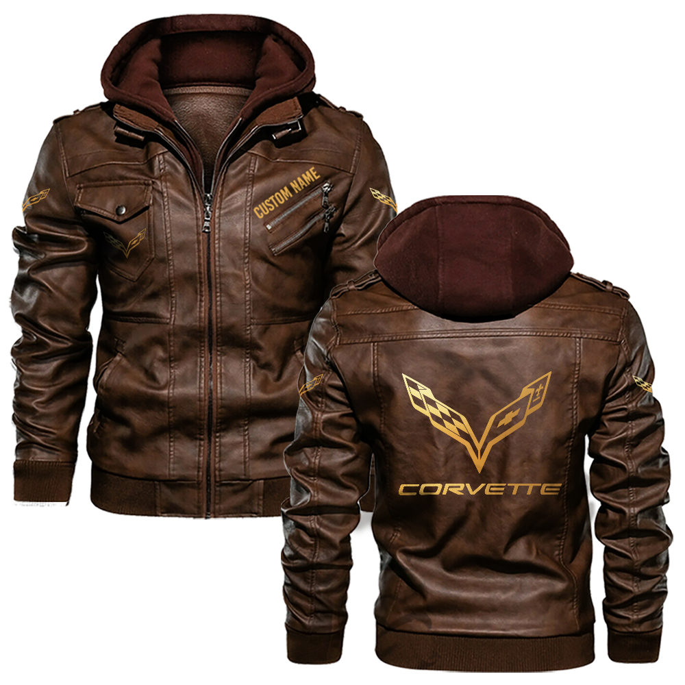 Chevrolet Corvette Golden Logo full style leather jackets, black and brown vintage style, customize name and logo