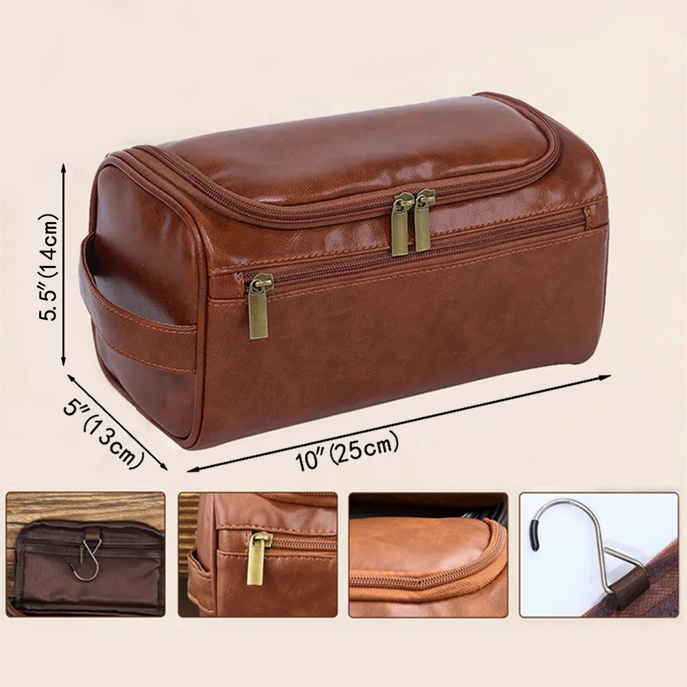 Upgrade his travel essentials with this personalized leather toiletry bag?the perfect blend of style, practicality, and sentiment. Skillfully crafted from premium leather, it offers a sleek, durable design with spacious compartments for easy organization of grooming essentials.